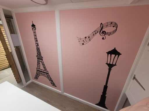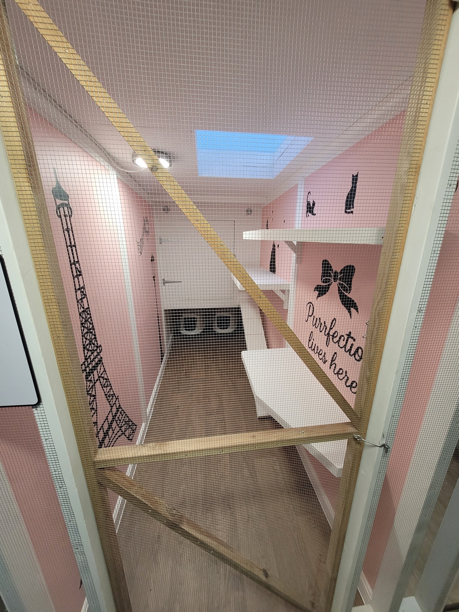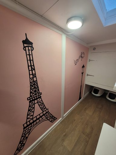 The walls are painted a soft pink and decorated with charming black silhouettes of the Eiffel Tower, a Parisian street lamp, music notes, and two cuddling cats, bringing a touch of Parisian magic to your cat’s home-away-from-home.