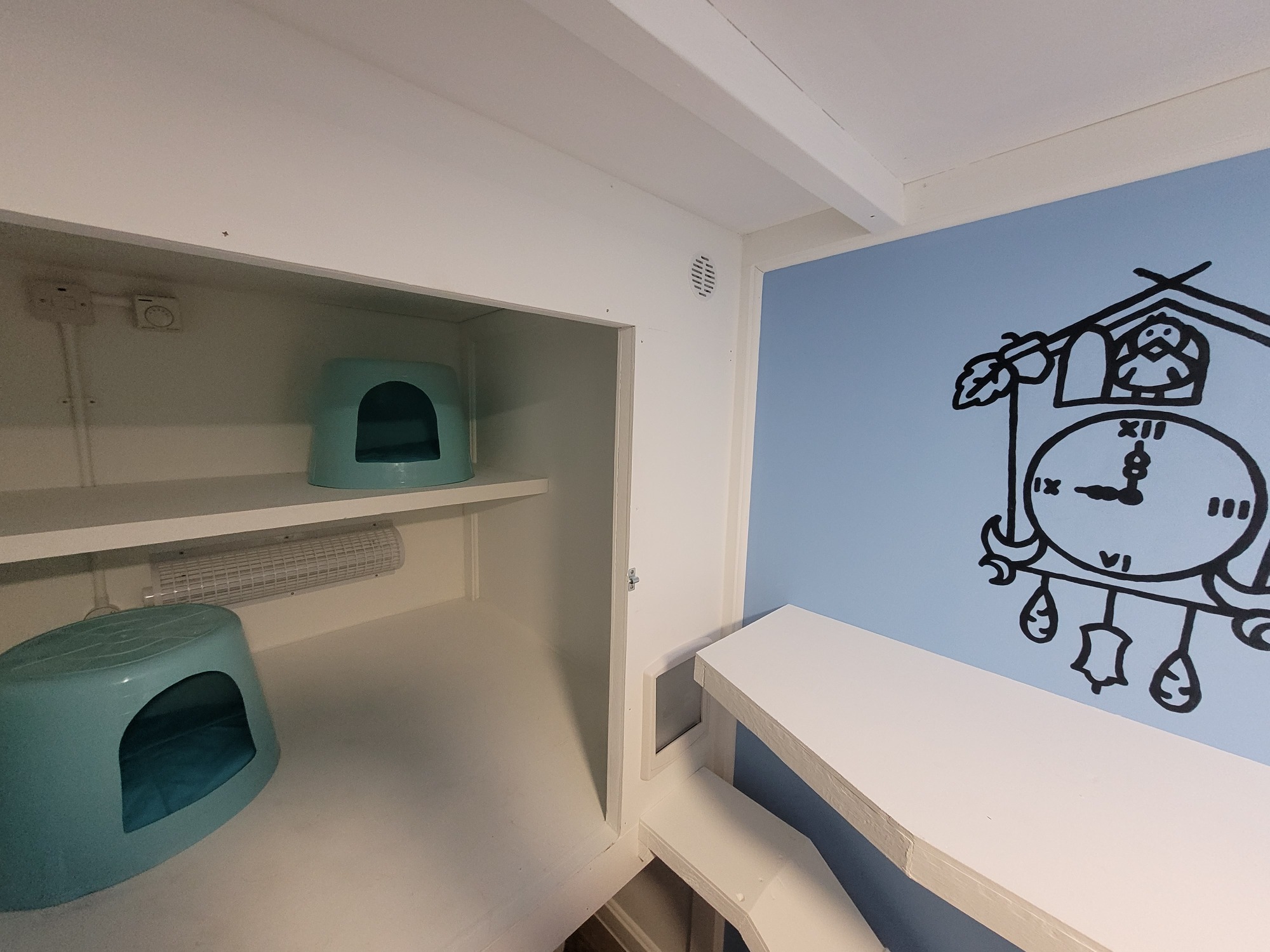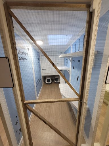 Step into Starlight Retreat, our serene blue pen inspired by Pinocchio. Designed to comfortably house two cats from the same household, it features a penthouse-style sleeping area accessed by a ramp and cat flap, plus three levels of climbing shelves for playful exploration.
