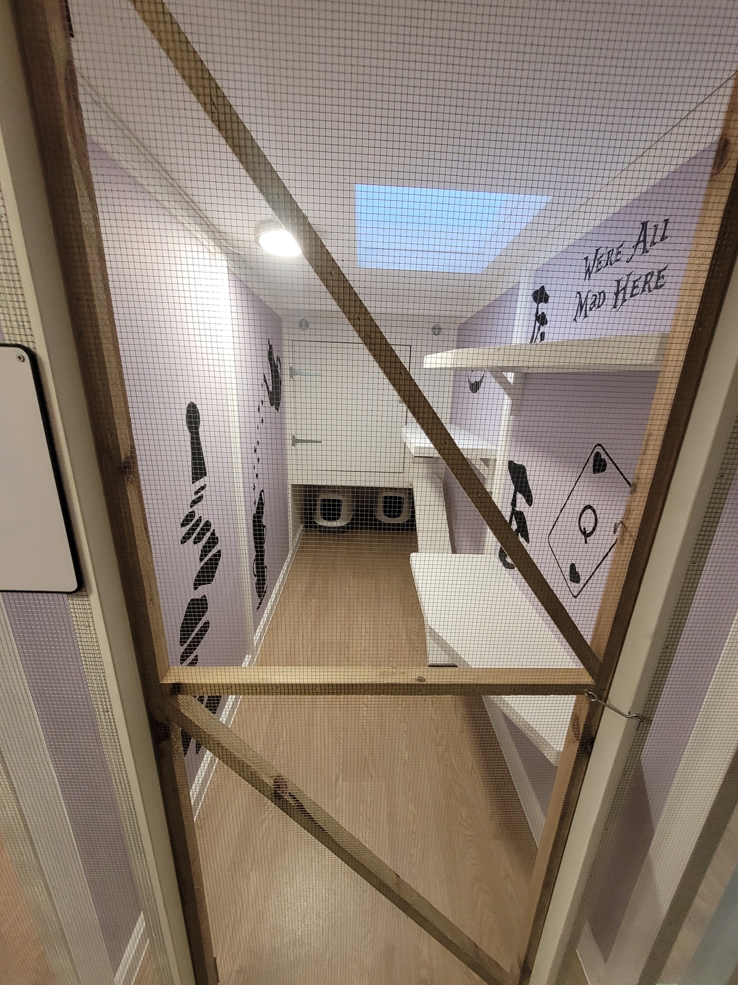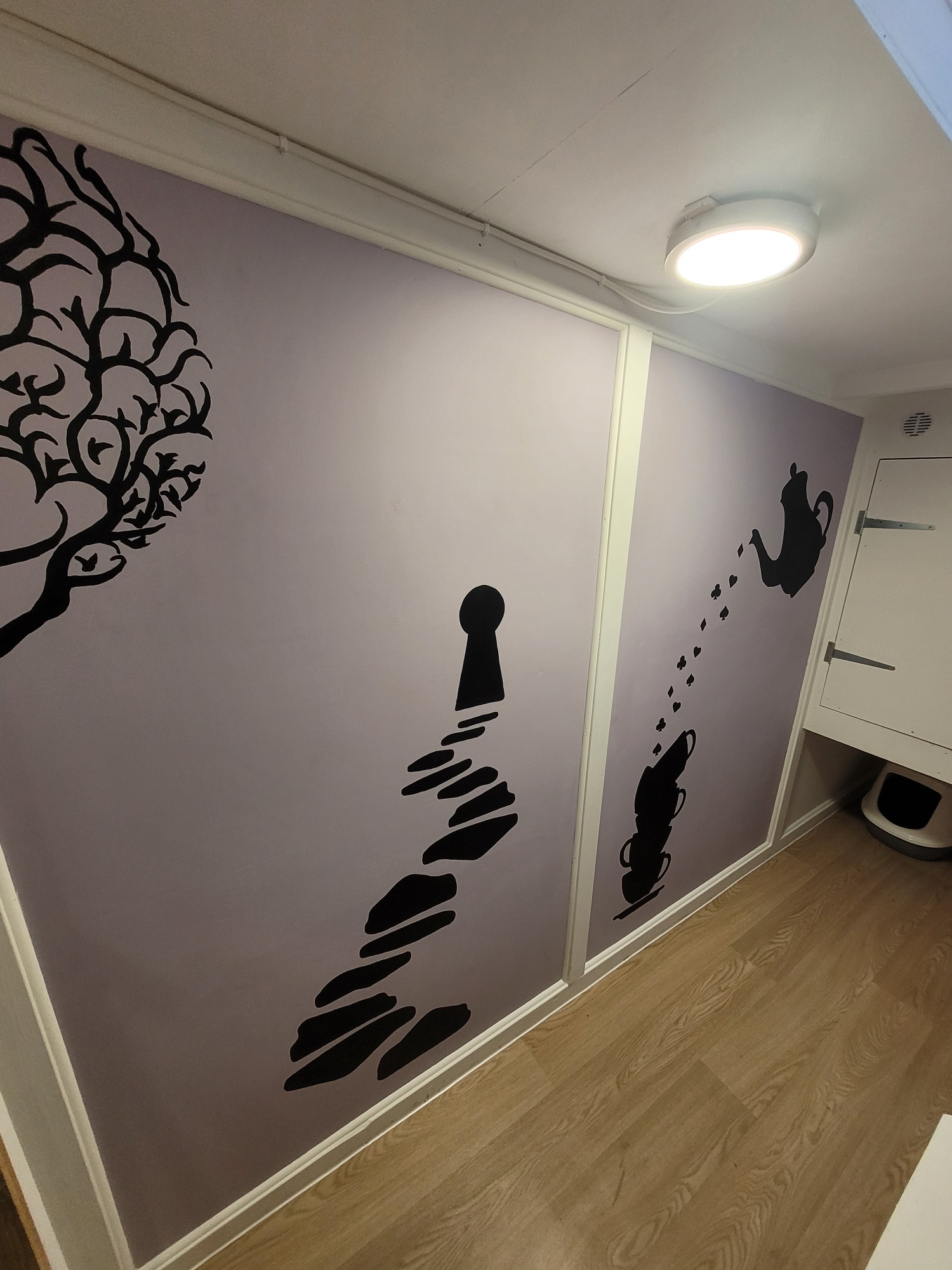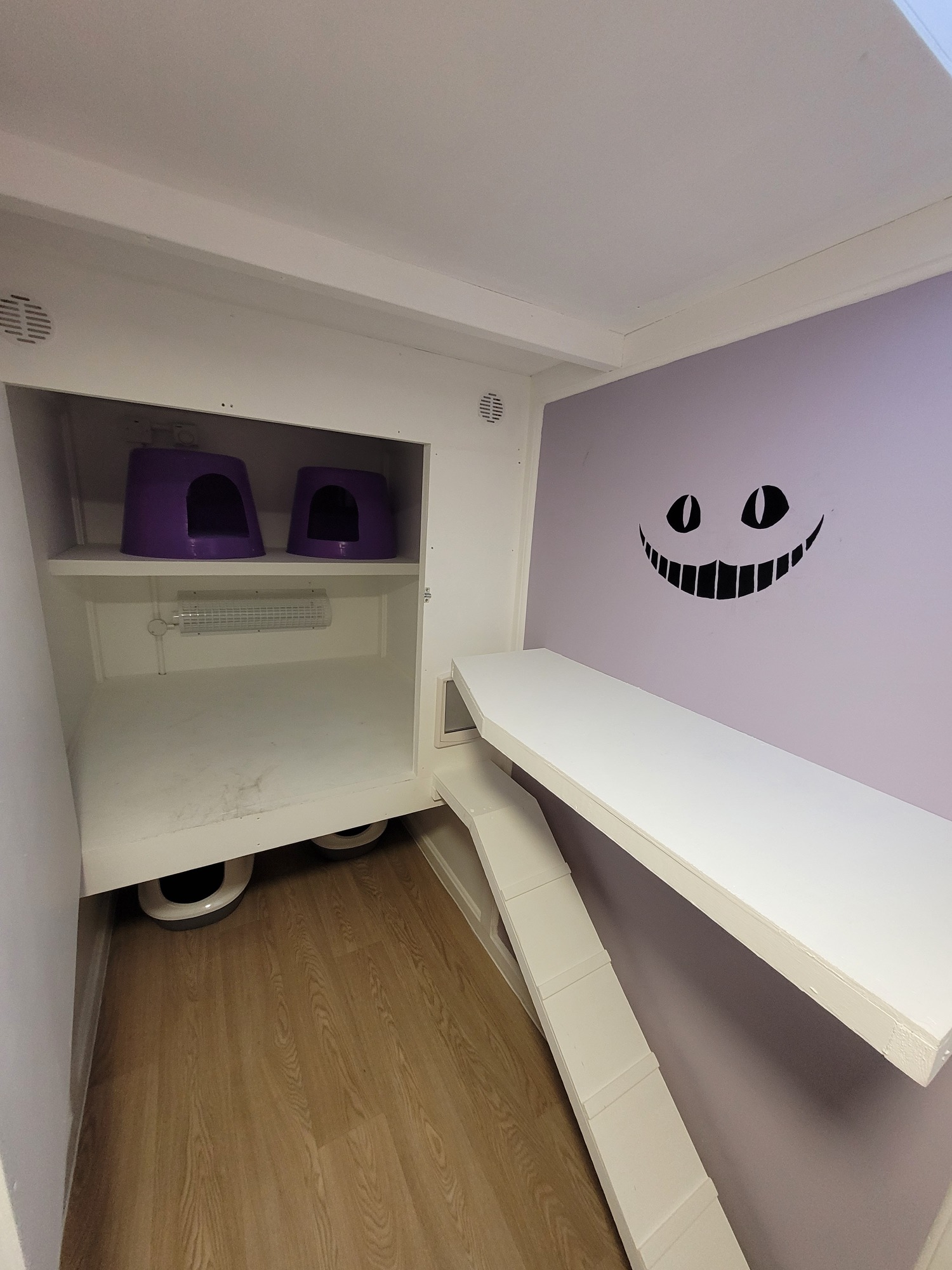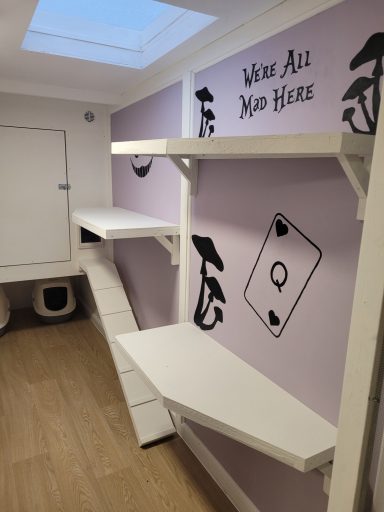 The walls are painted a delightful purple and decorated with black silhouettes of a teacup and teapot, a keyhole, the Cheshire Cat’s iconic smile, and the famous quote: “We’re all mad here.” This playful theme creates a magical, imaginative space your cats will love to explore.
