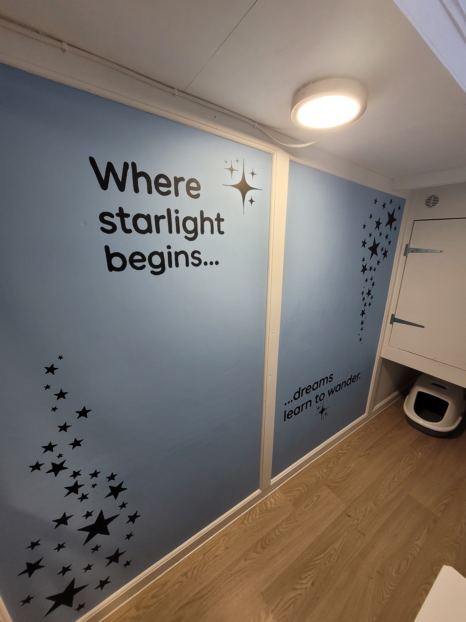 The soft blue walls are adorned with black silhouettes of twinkling stars and a cuckoo clock, creating a calm, magical environment perfect for relaxing and watching the world go by.