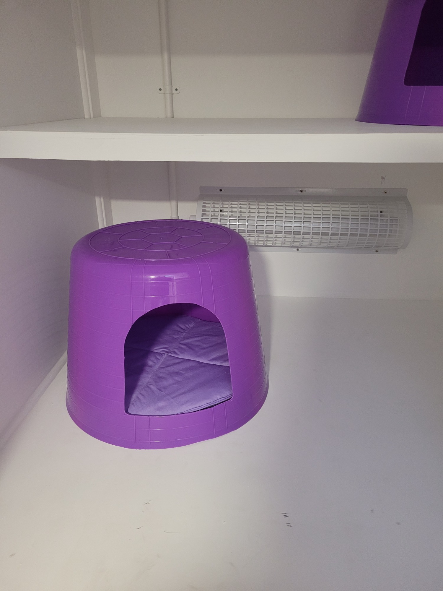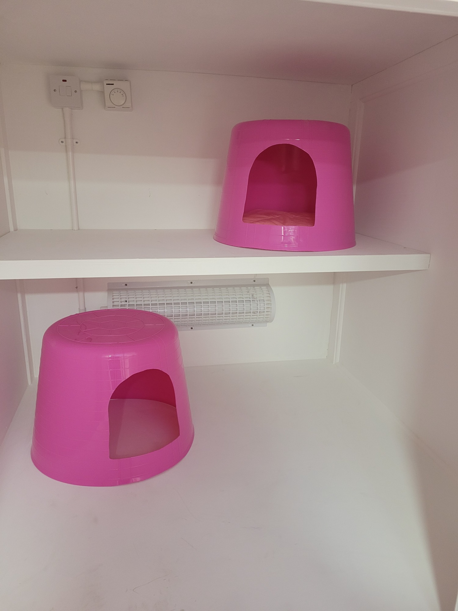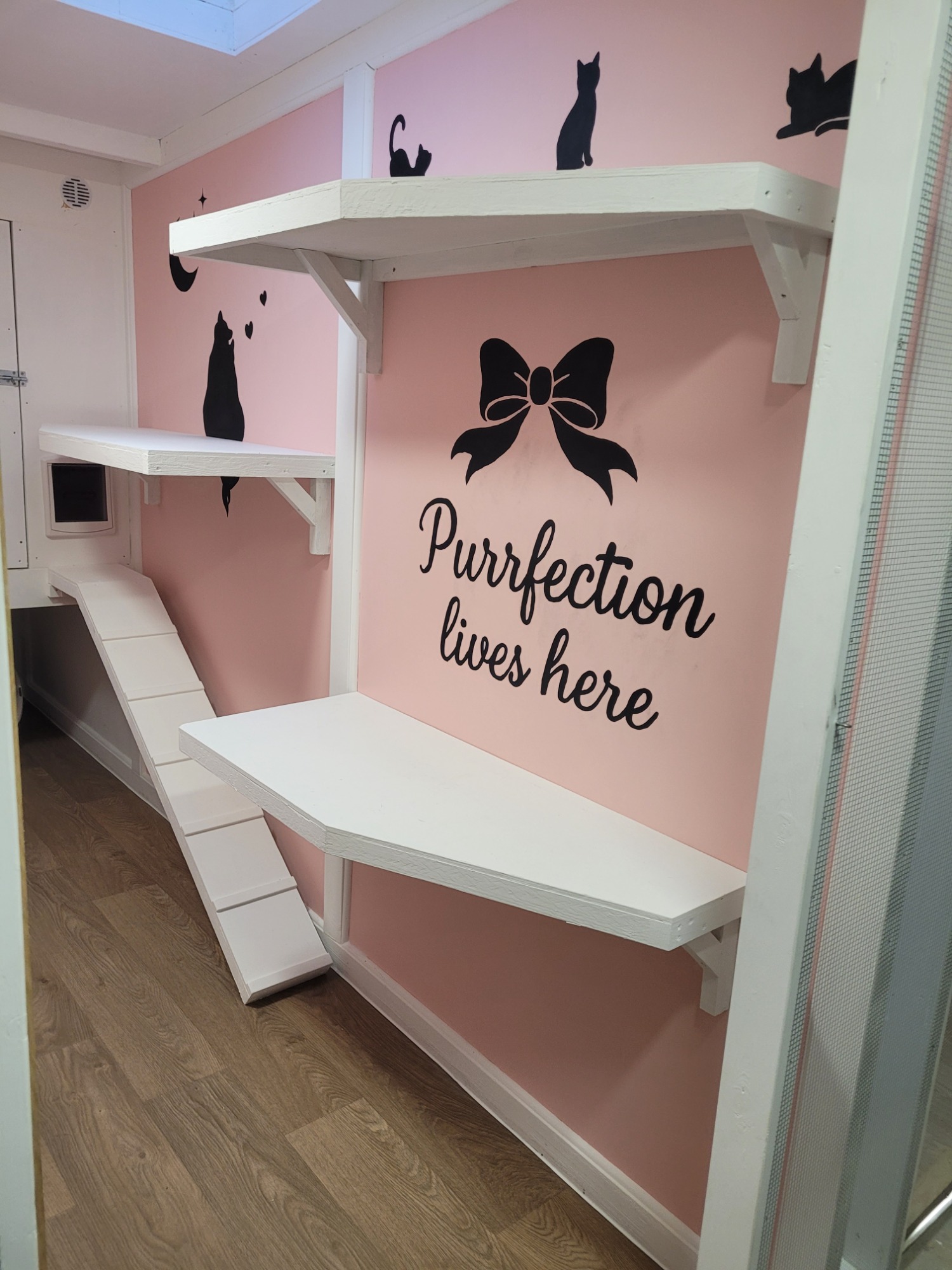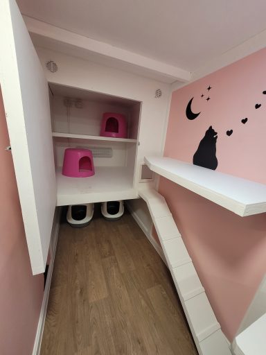 Step into The Duchess Suite, our elegant pink pen inspired by The Aristocats. Spacious enough to comfortably house two cats from the same household, it features a penthouse-style sleeping area accessed by a ramp and cat flap, along with three levels of climbing shelves for endless exploration and play.