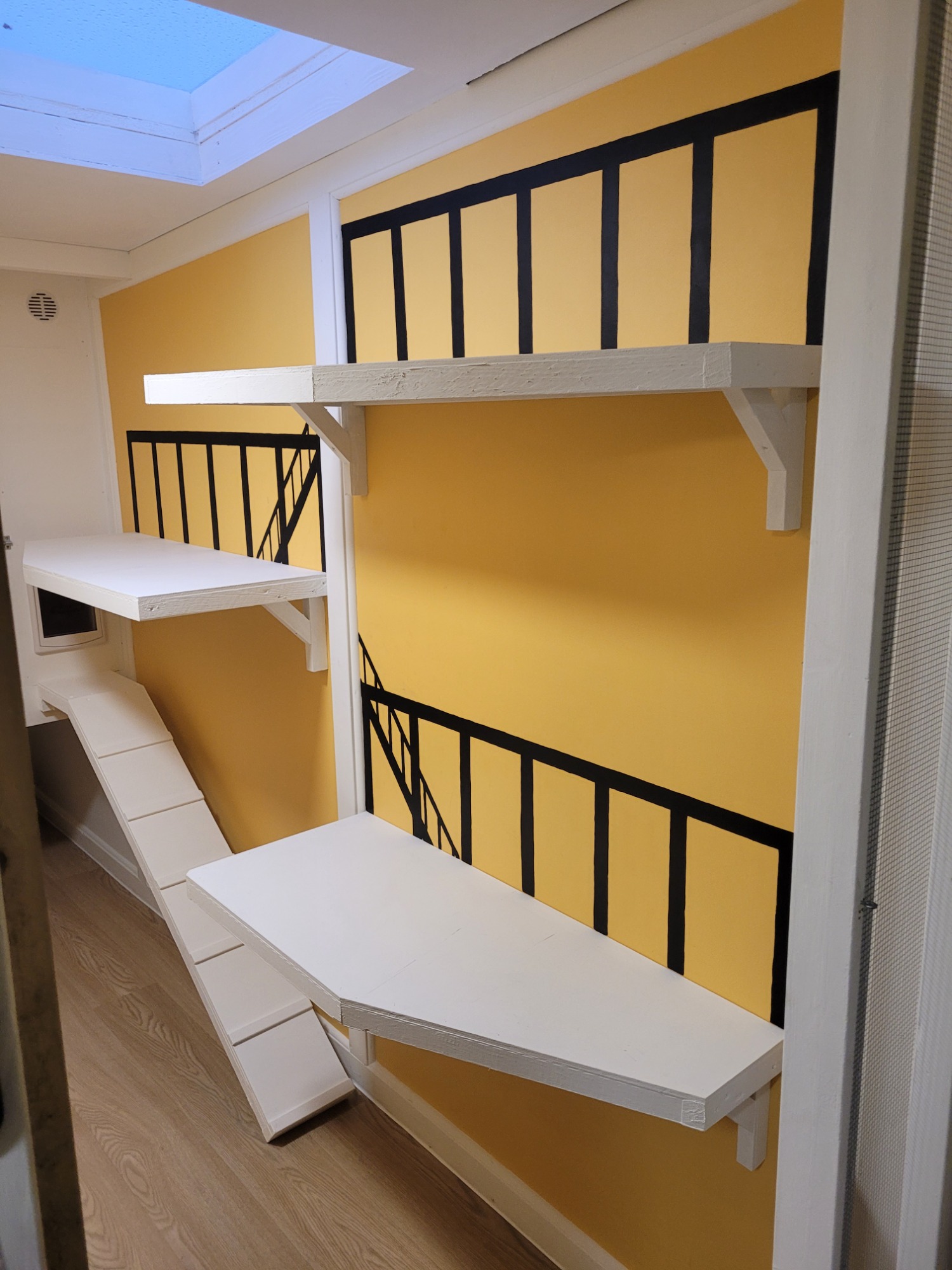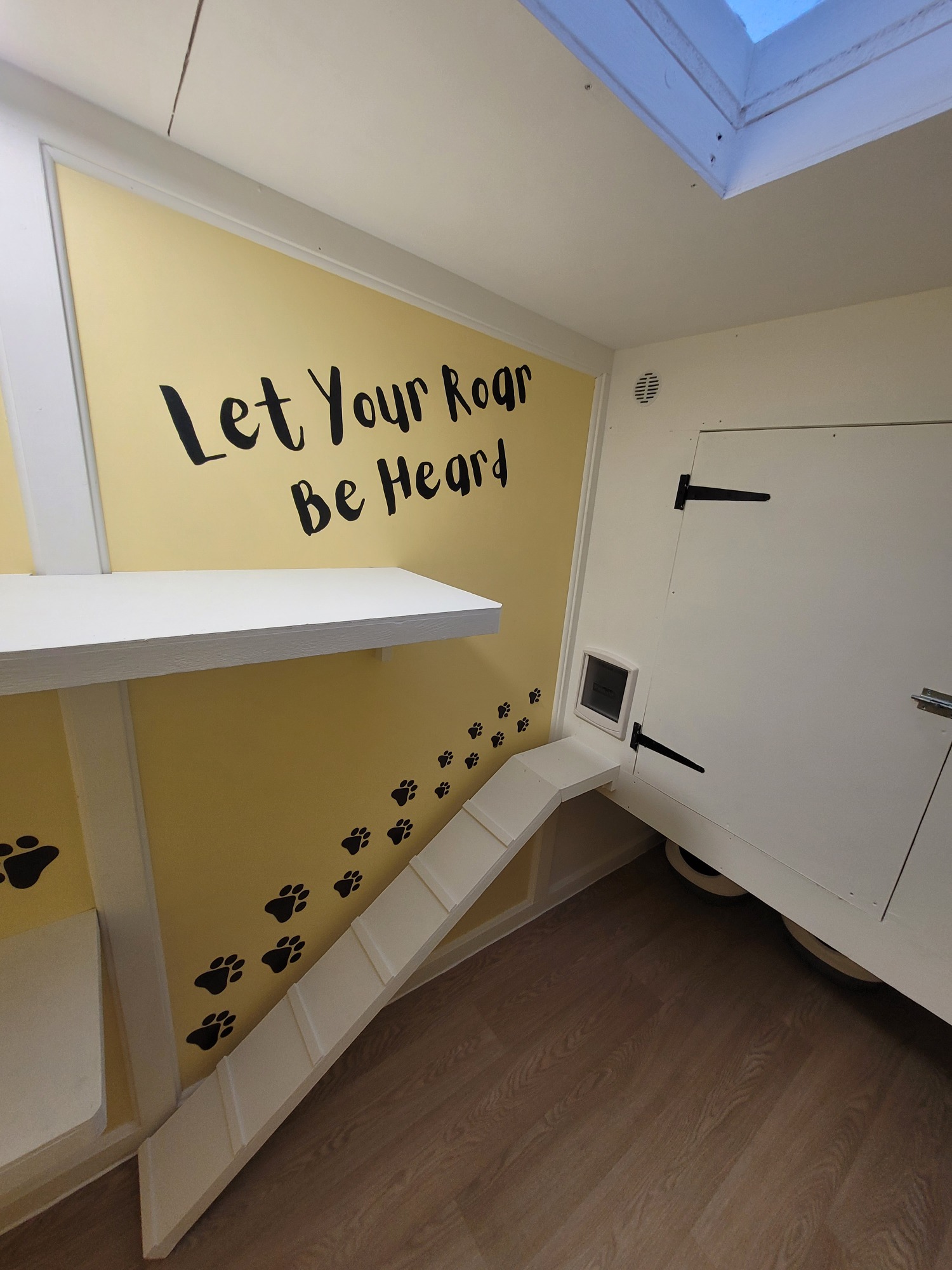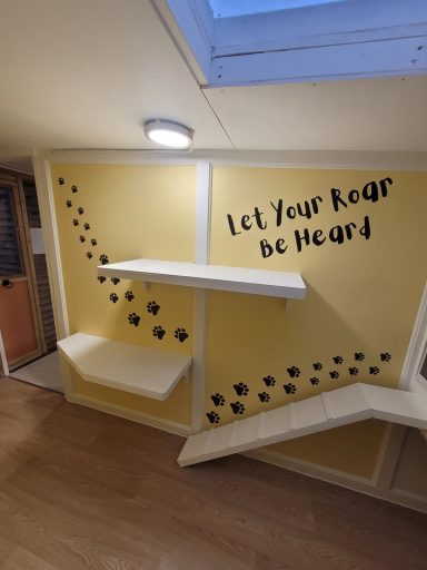 Step into The Golden Savannah Lounge, our spacious yellow pen inspired by The Lion King. Large enough to comfortably house up to four cats from the same household, it features a penthouse-style sleeping area accessed by a ramp and cat flap, plus three climbing shelves for play and exercise.