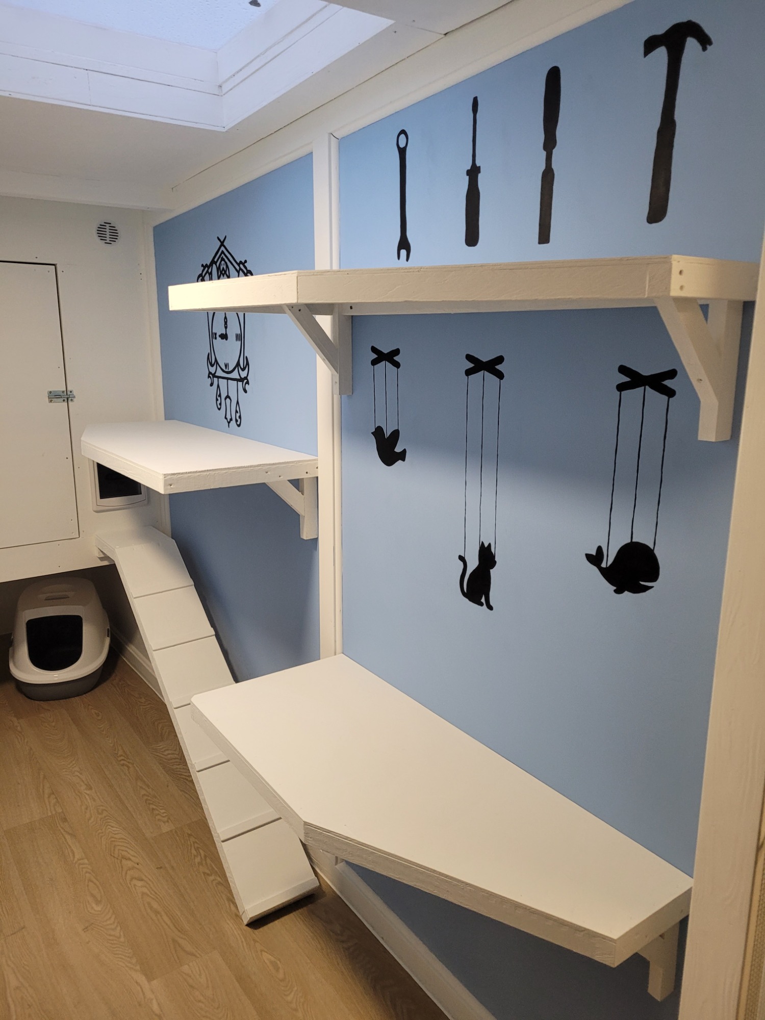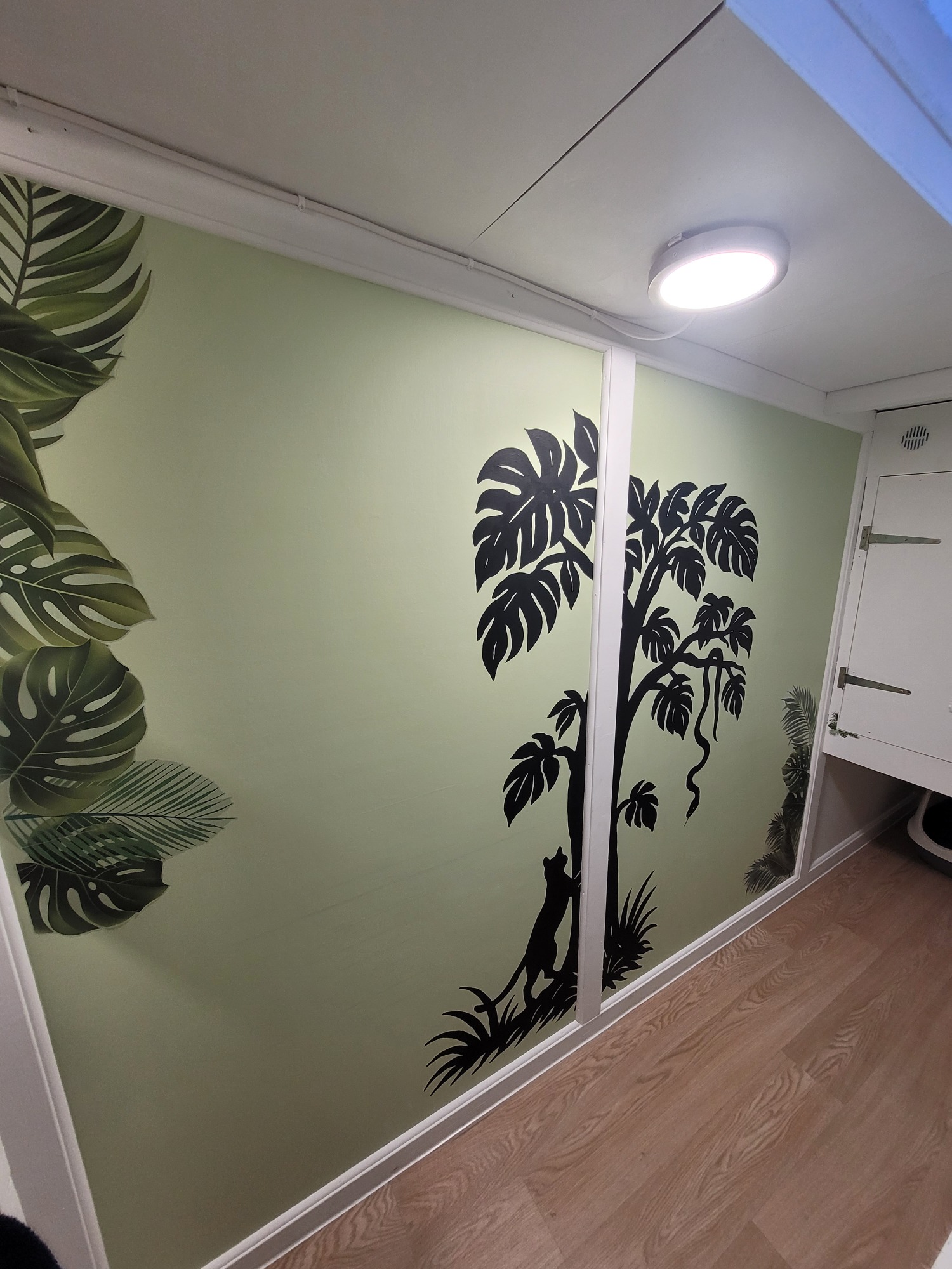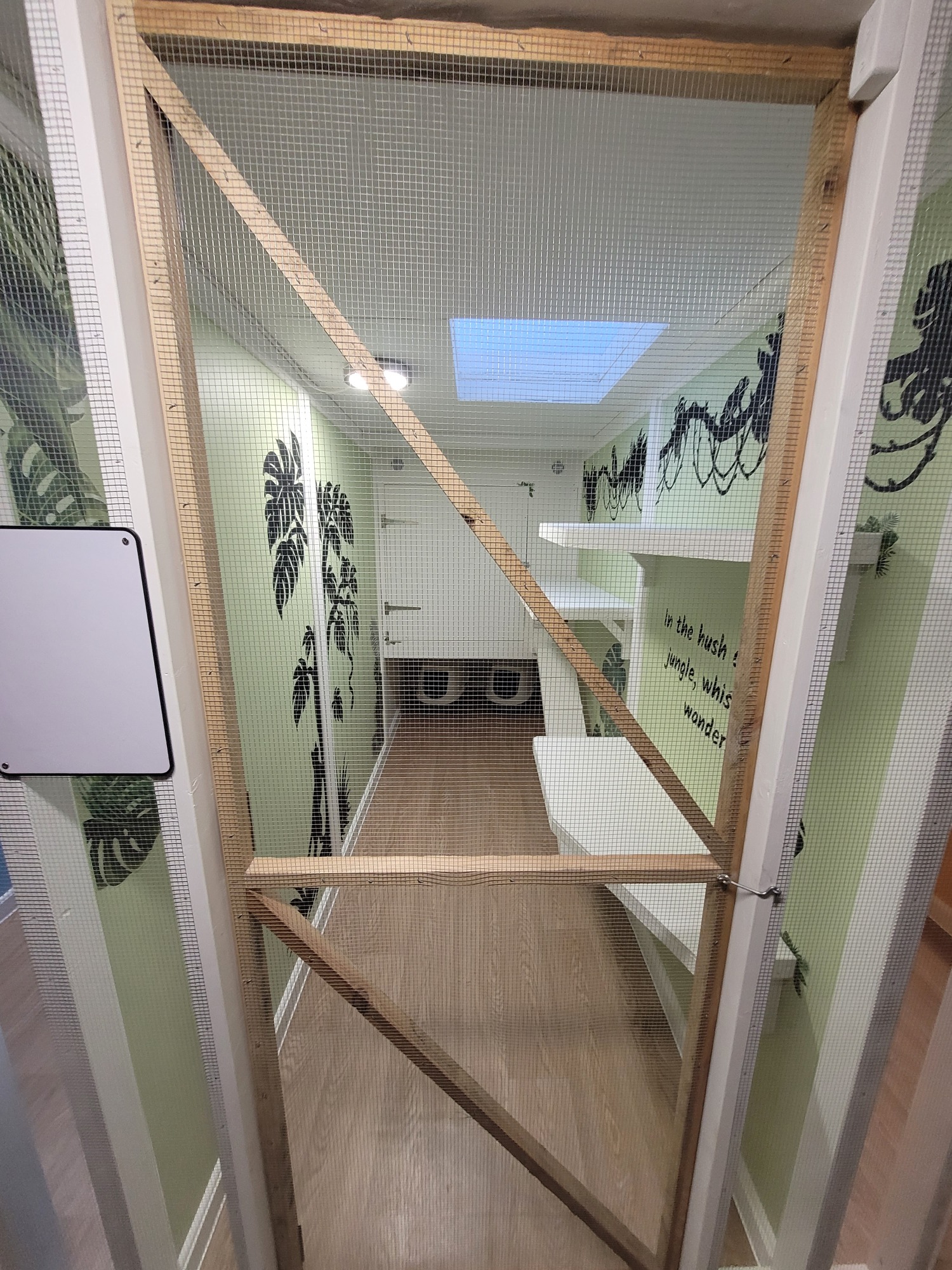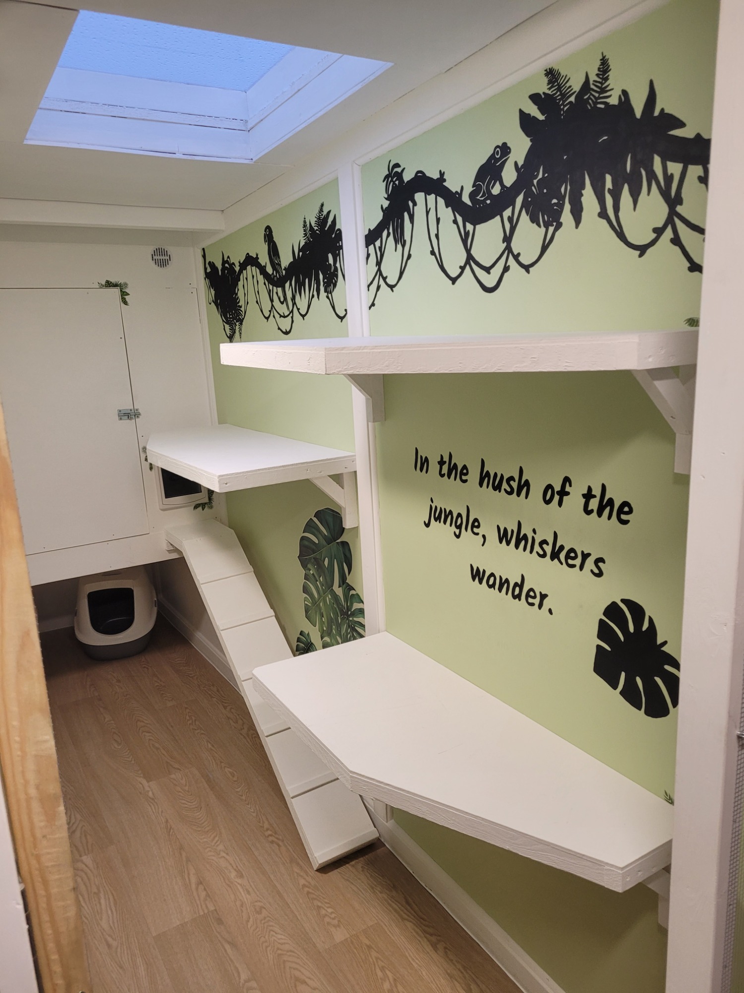 The walls are decorated with jungle leaf stickers, bringing a lush, adventurous feel to your cat’s space — a little jungle hideaway where curiosity and fun abound.